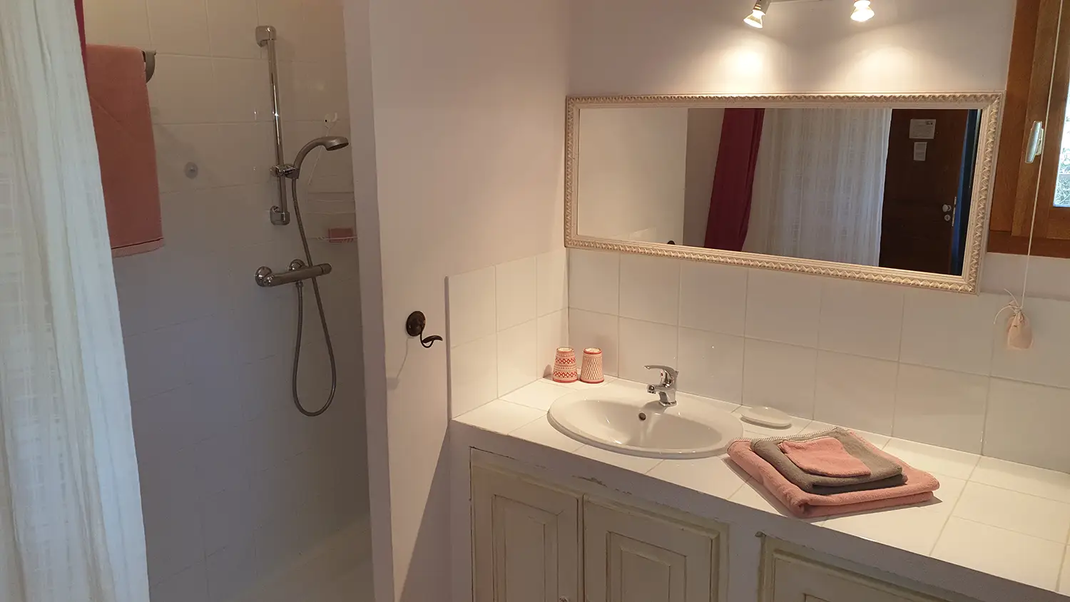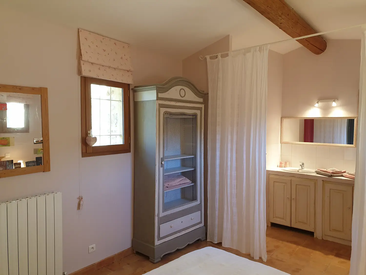 Une belle chambre avec lit double 160 x 200 cm, lavabo, douche, WC privatifs, petit frigo, petite terrasse privée, accès internet, possibilité de mettre un lit enfant. Accès indépendant.